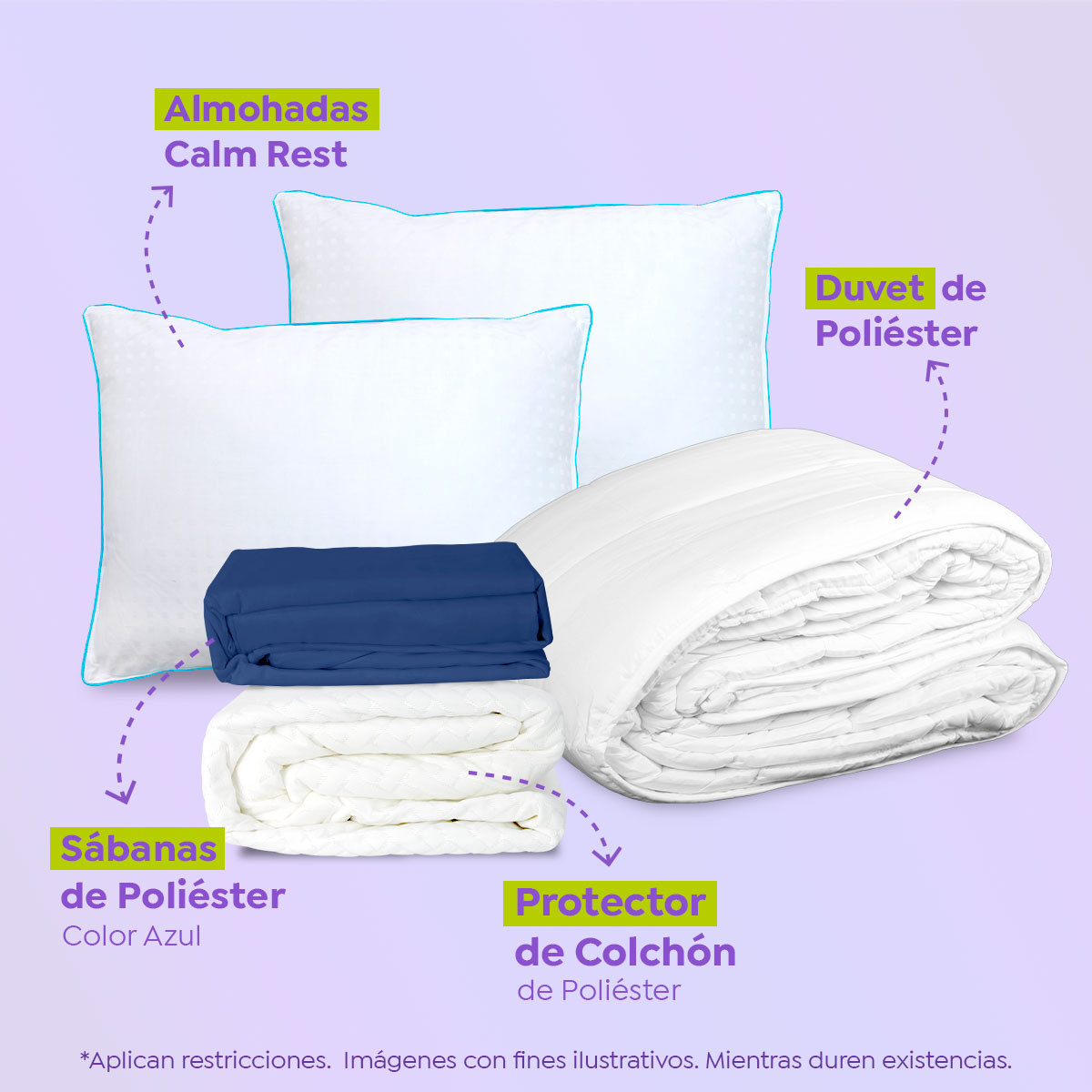Disfruta noches cómodas y sin preocupaciones con el Set de Accesorios: duvet, sábanas, protector y almohadas en 100% poliéster. Suaves, resistentes y fáciles de cuidar, pensados para brindarte frescura, protección y un descanso sin complicaciones.